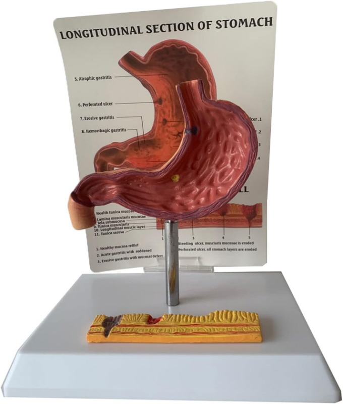 Model žalúdka zobrazuje rôzne štádiá gastritídy od mierneho žalúdočného vredu až po perforáciu.