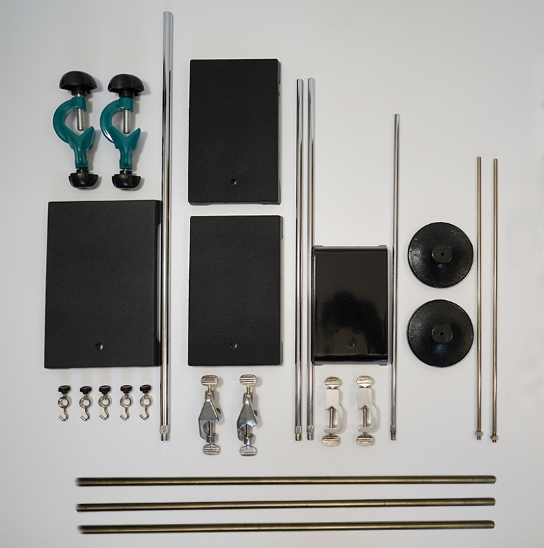 • 1 stojan na byretu (kovová základňa: 15 x 22,5 x 2 cm, 1,8 kg, oceľová tyč: 60 cm, Ø 12 mm / M12);
