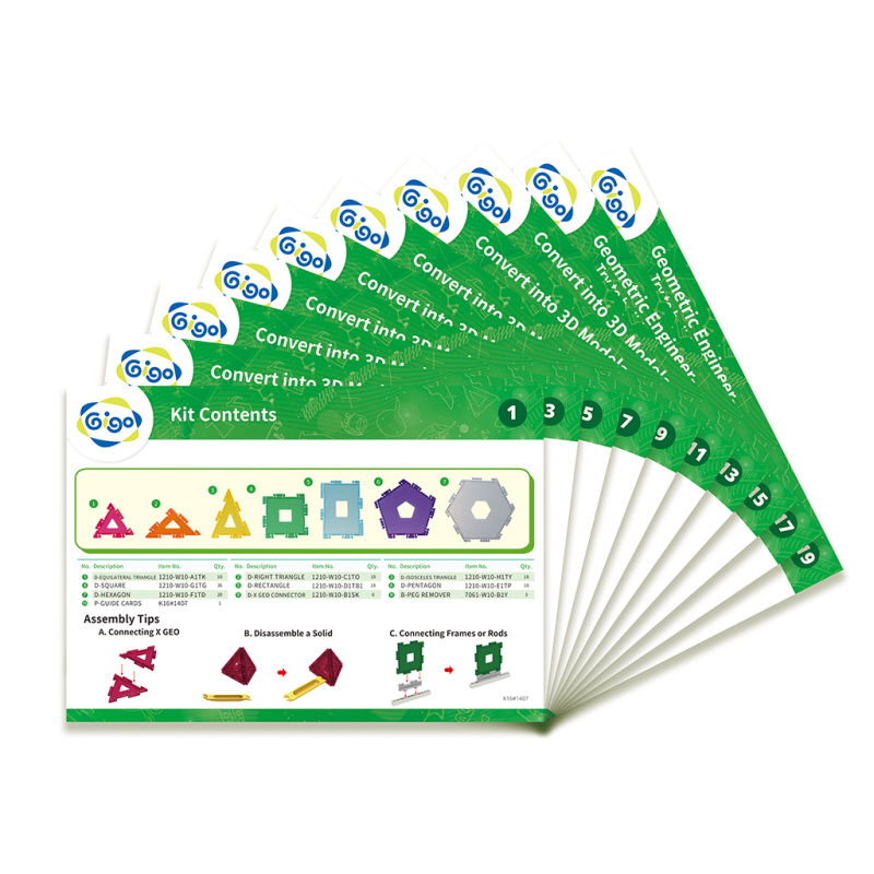 Okrem toho vám 10 obojstranných kartičiek s úlohami pomôže zostaviť 3D tvary.